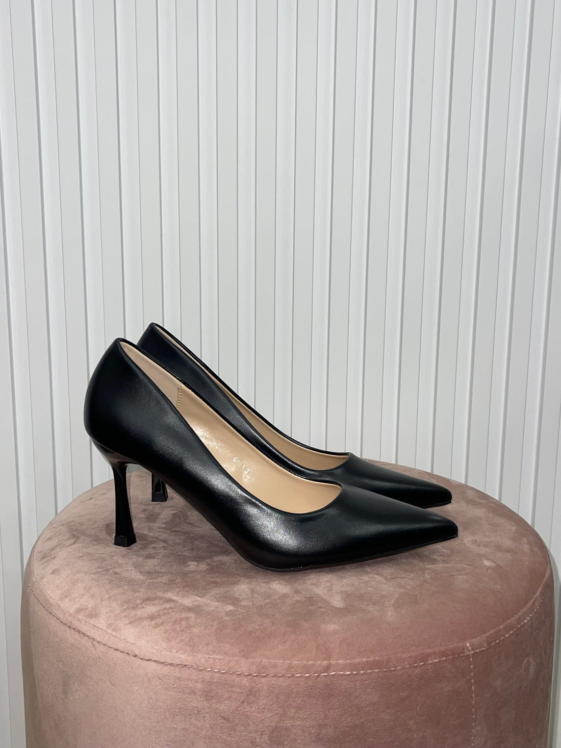 Decolletè in ecopelle nera opaca, con punta allungata e tacco lucido, sottile medio.