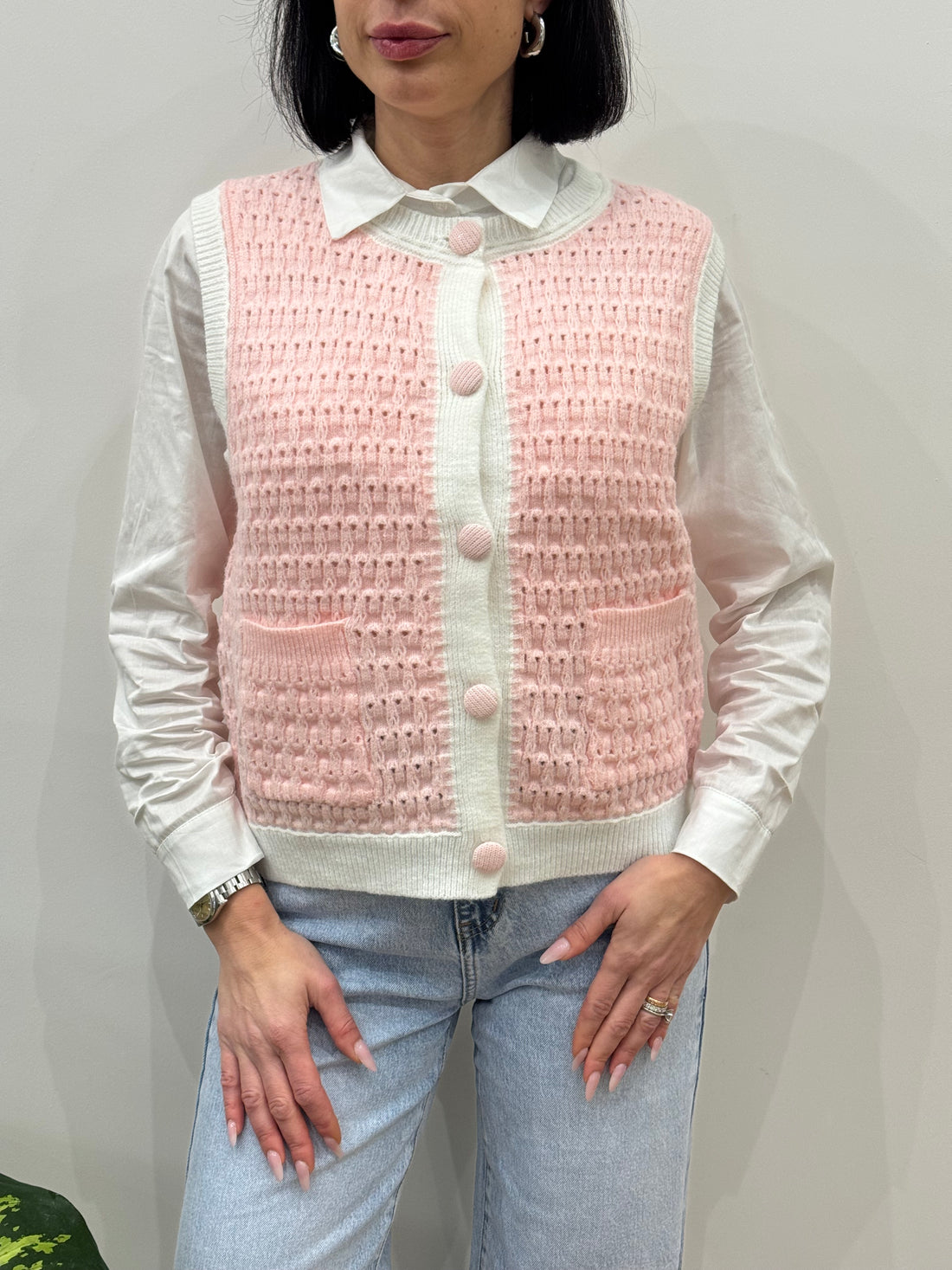 Gilet con bottoni a contrasto. Porta delle tasche sul davanti.