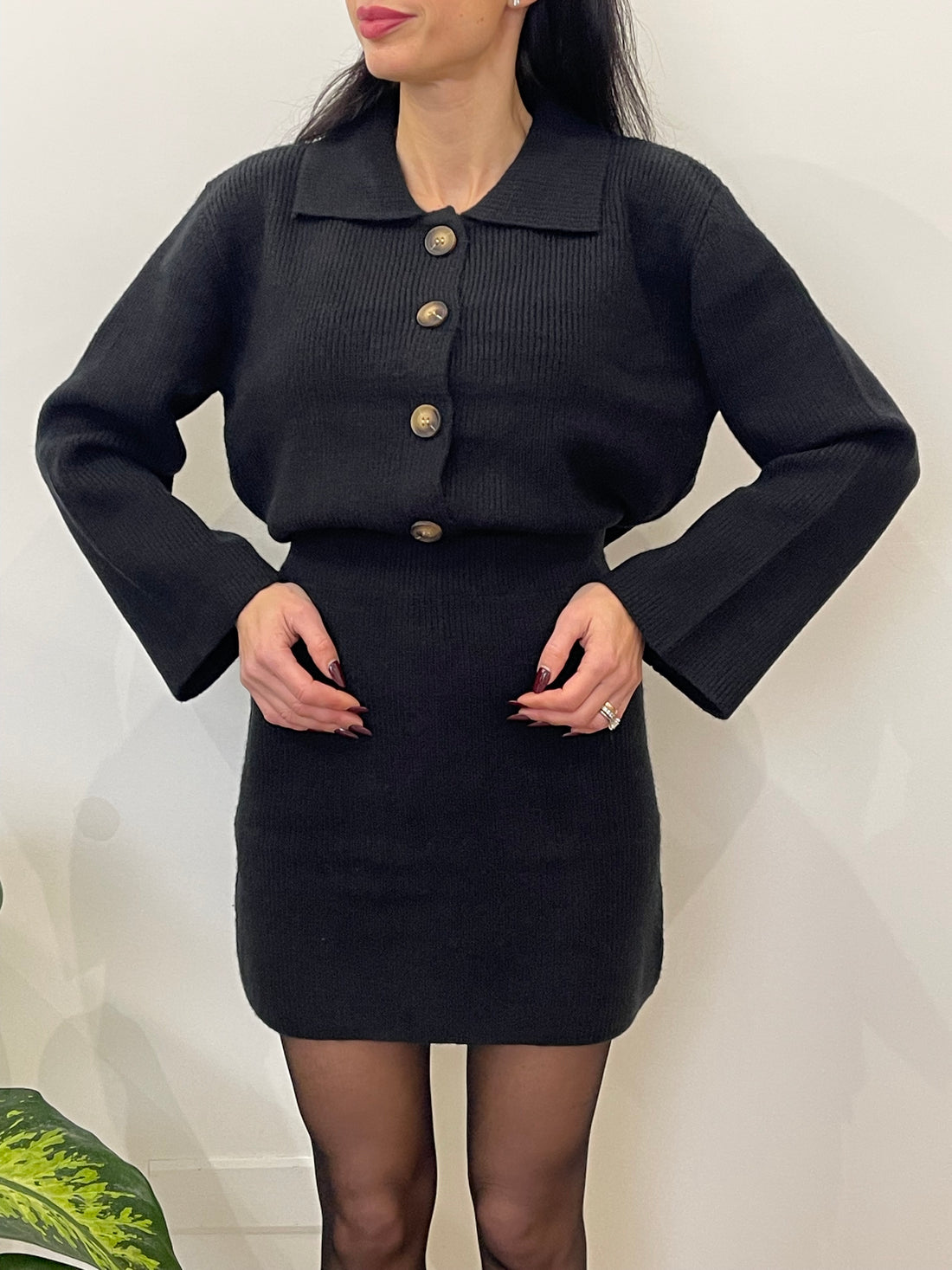 Coordinato composto da: cardigan, lunghezza basic, con bottoni marroni e dalla gonna. Tessuto elasticizzato e...