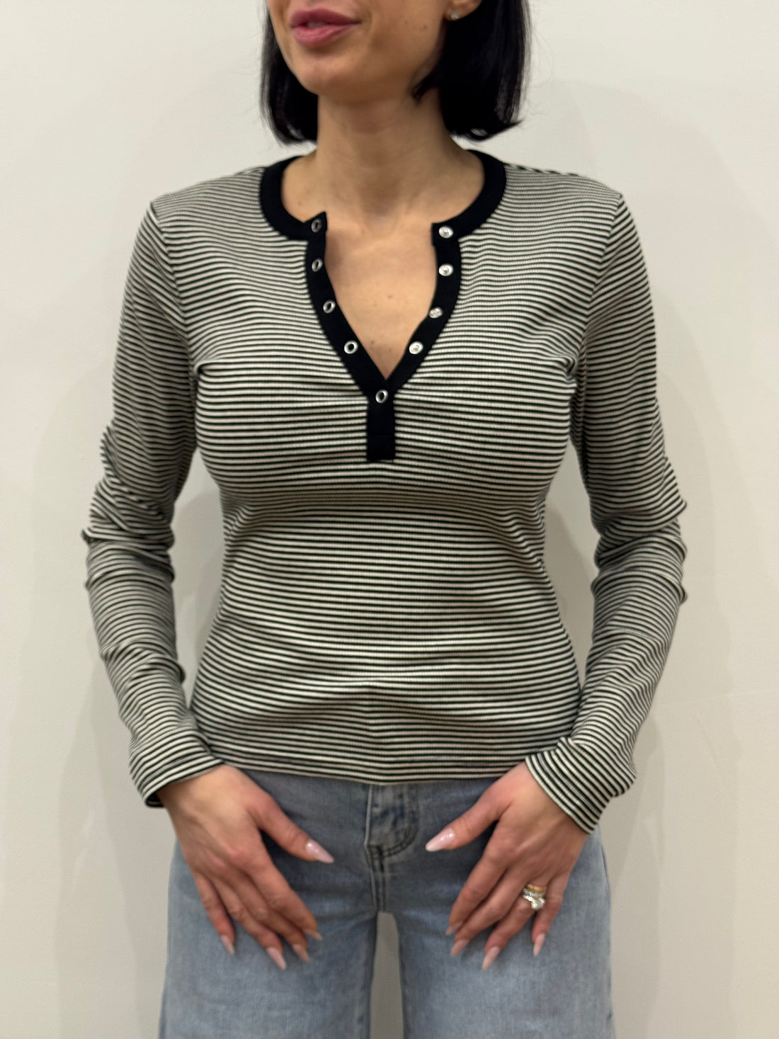 Maglia con bottoncini, piccole righe colore nero e bianco.