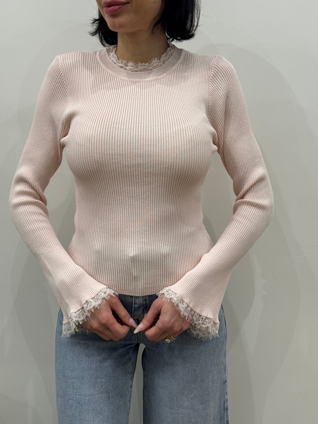 Maglietta in filo a costine con dettaglio sulla manica e sul girocollo del pizzo.