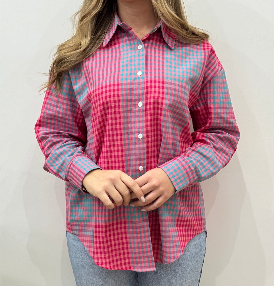 Camicia taglio over, contrasto con il rosa e il celeste.