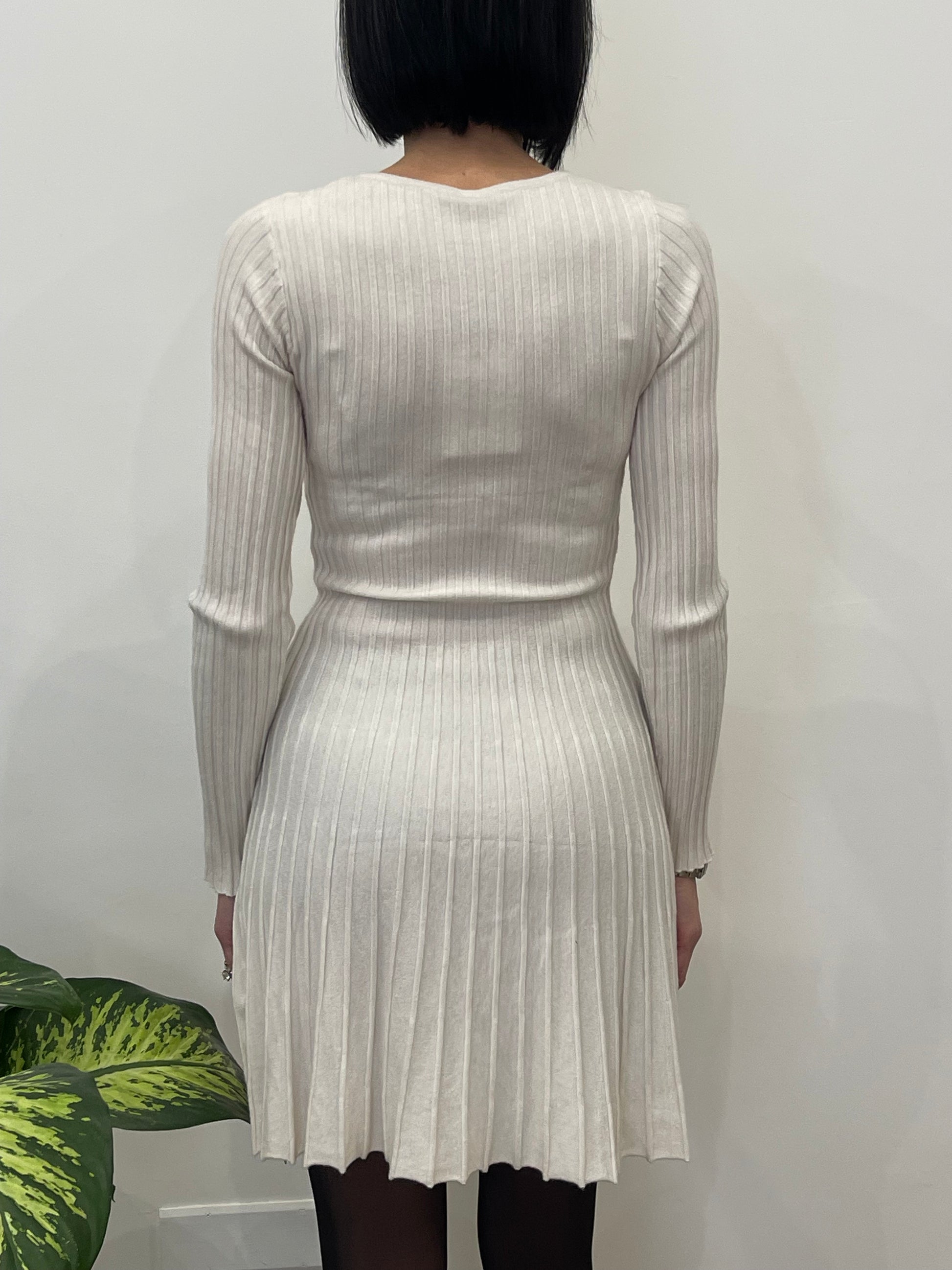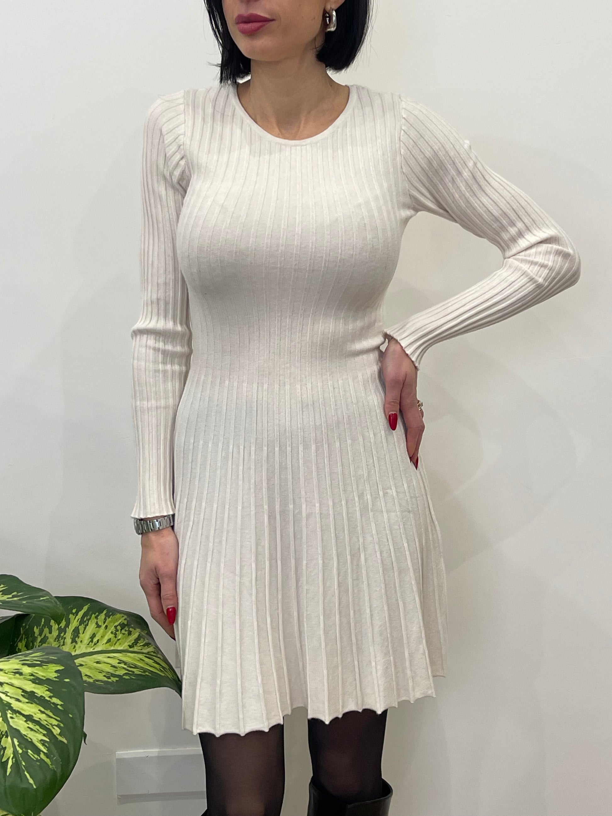 Abito in maglia a costine. Presenta scollo rotondo, con una vestibilità aderente nella parte superiore. La gonna si apre con una lavorazione plissè.