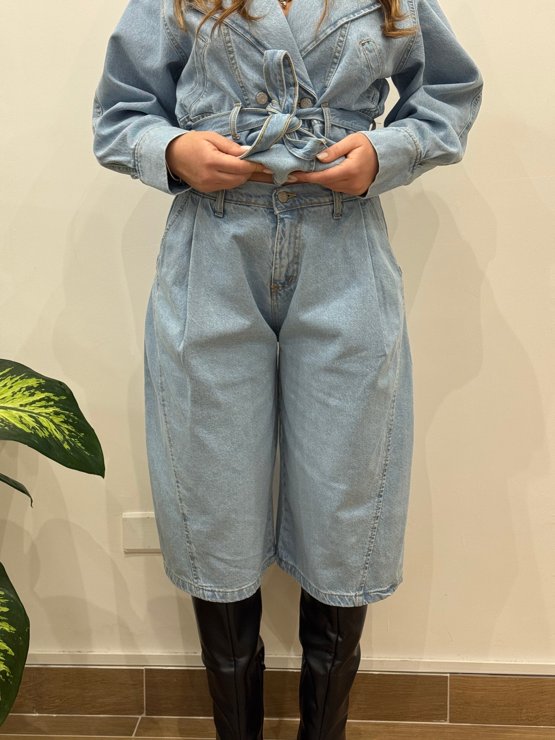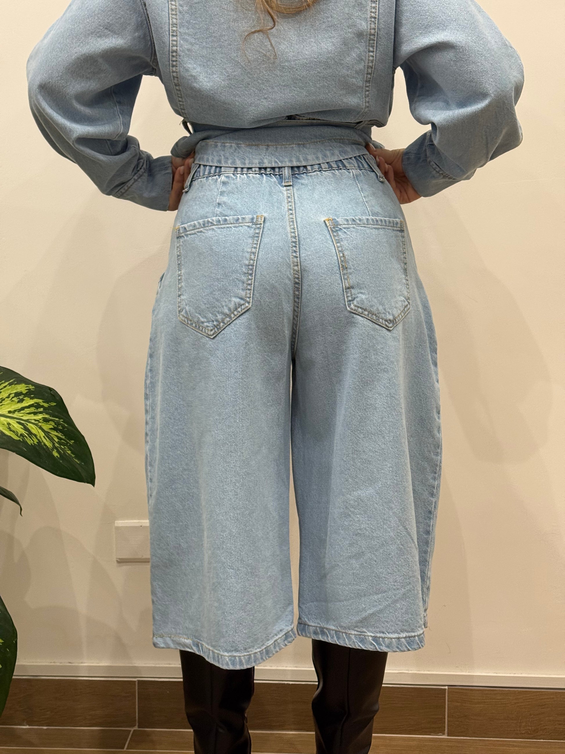 Bermuda modello baloon, lungo fino al ginocchio. Ha le tasche e porta un elastico nella parte retro.