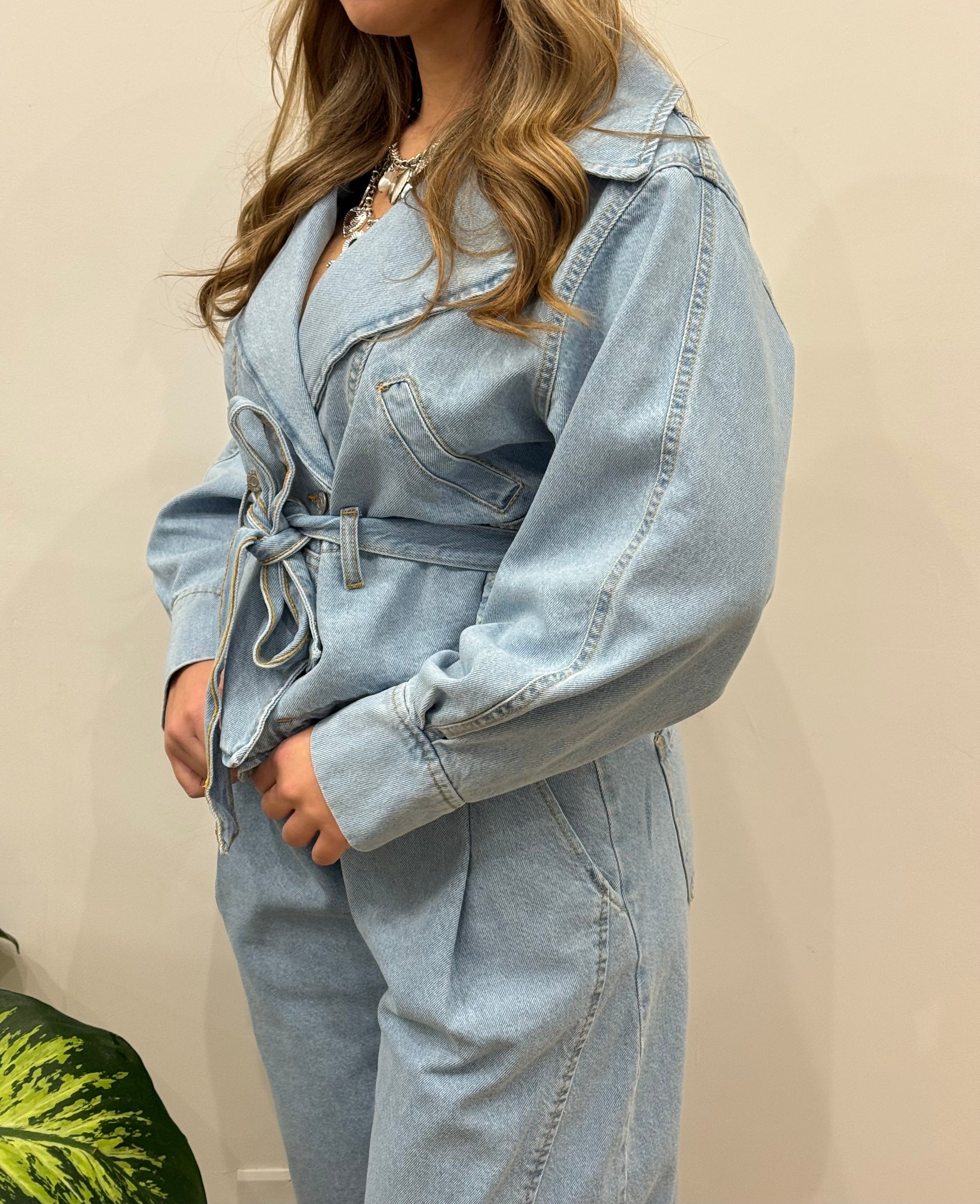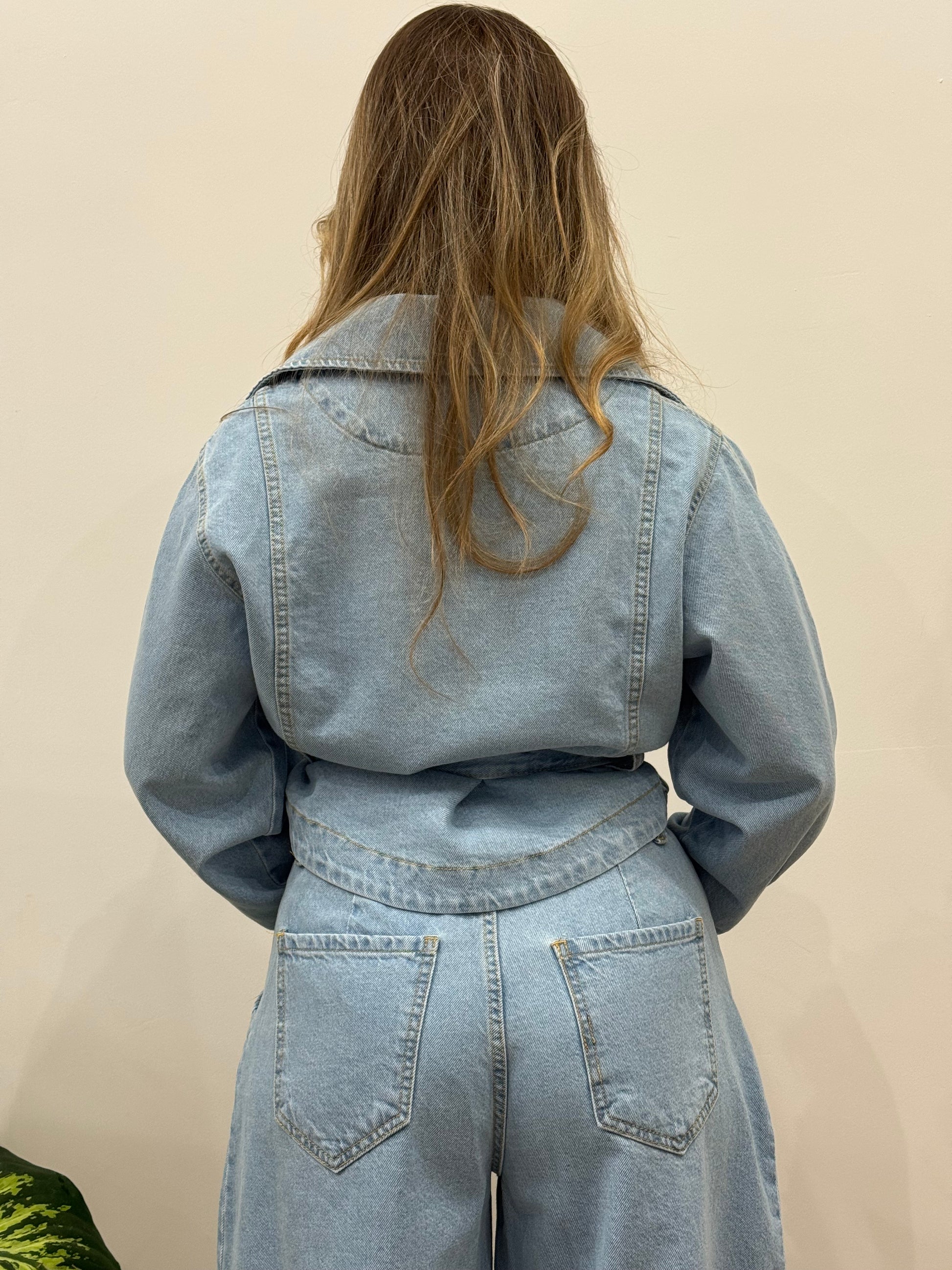 Blazer corto in denim, lavaggio chiaro. Porta una cinta in vita.