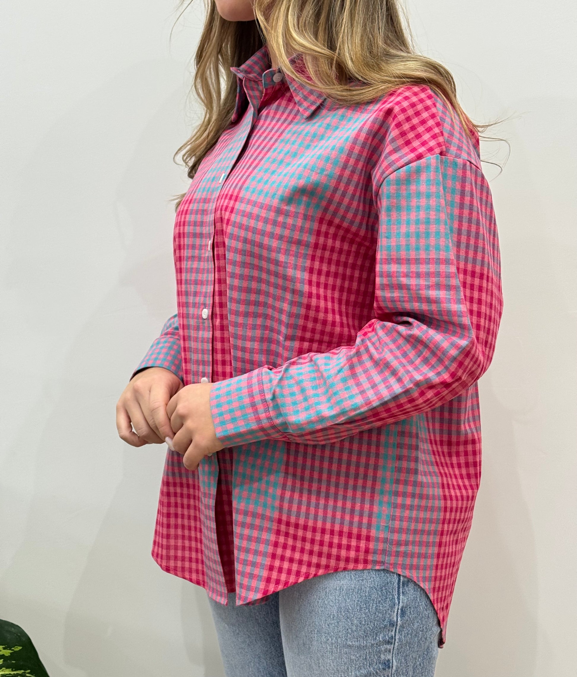 Camicia taglio over, contrasto con il rosa e il celeste.