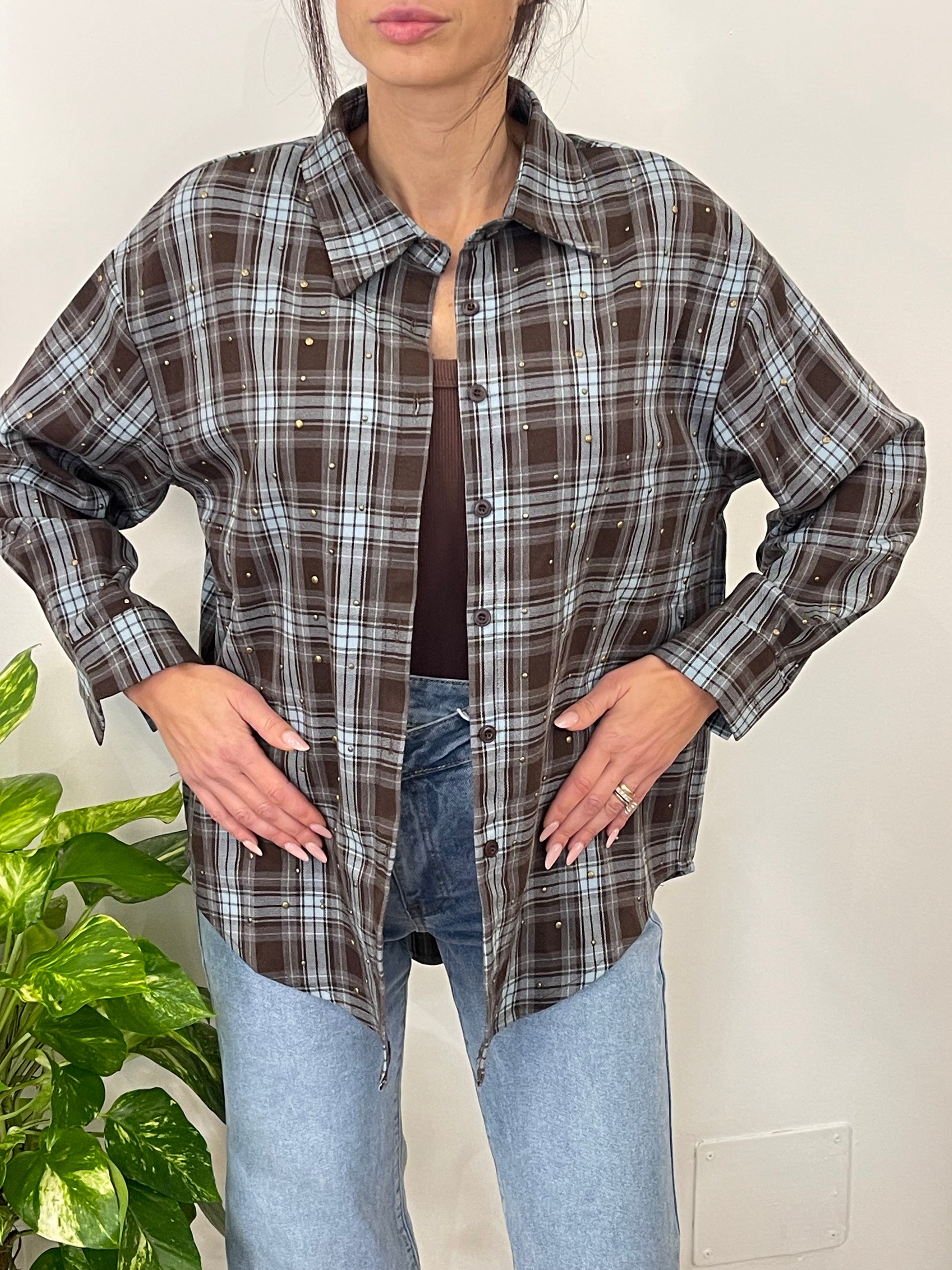 Camicia misto cotone, oversize a quadri, con la particolarità delle borchie.