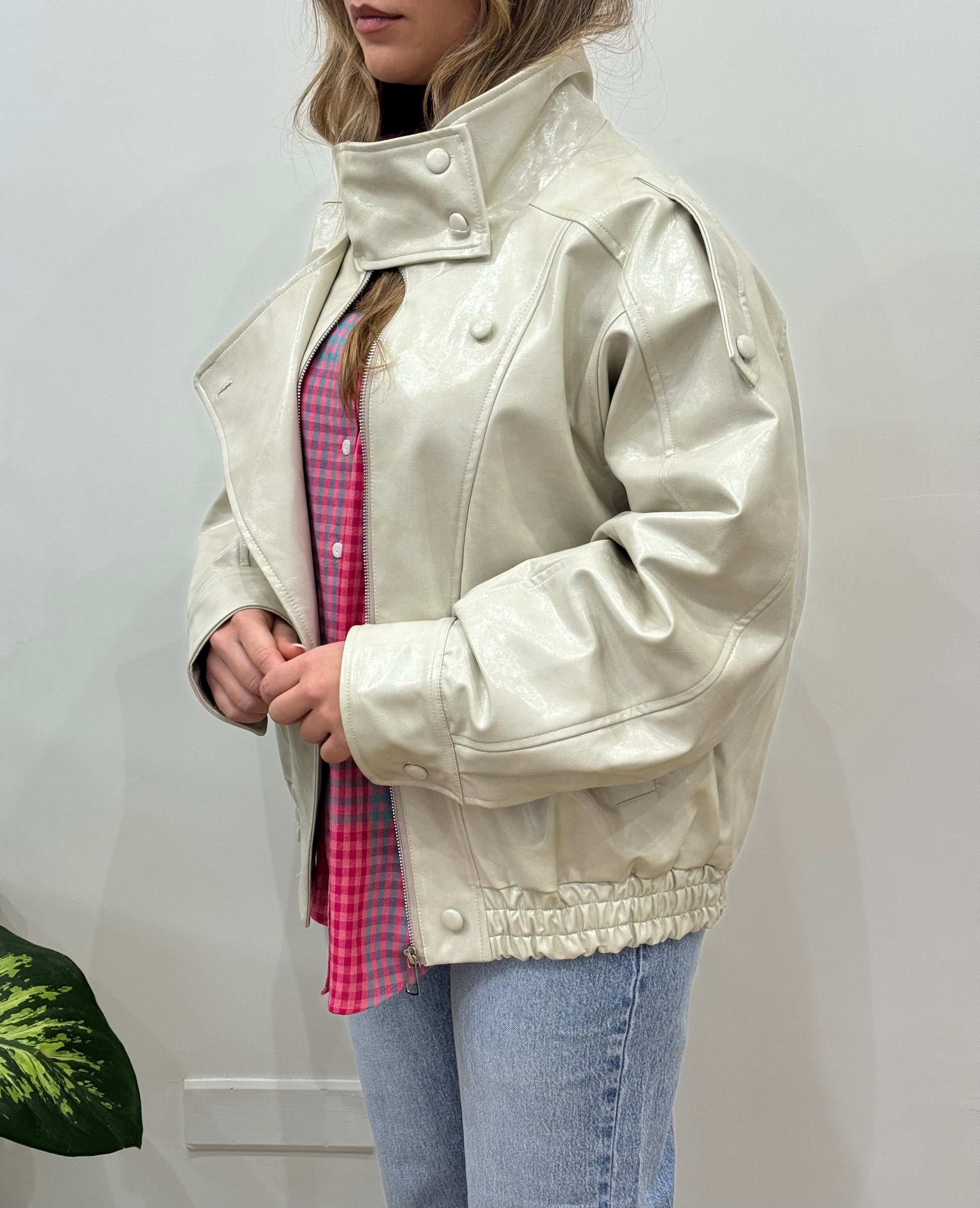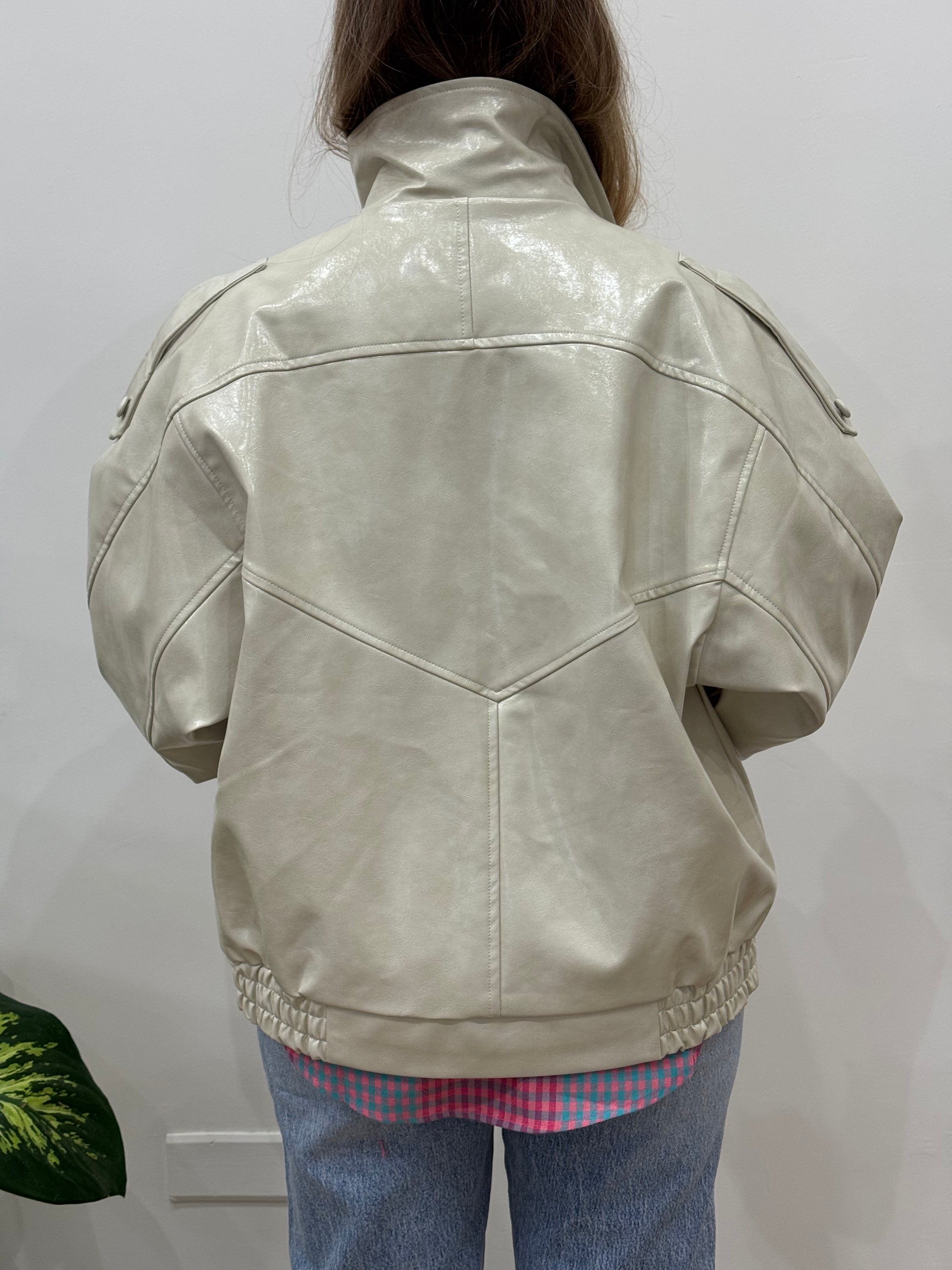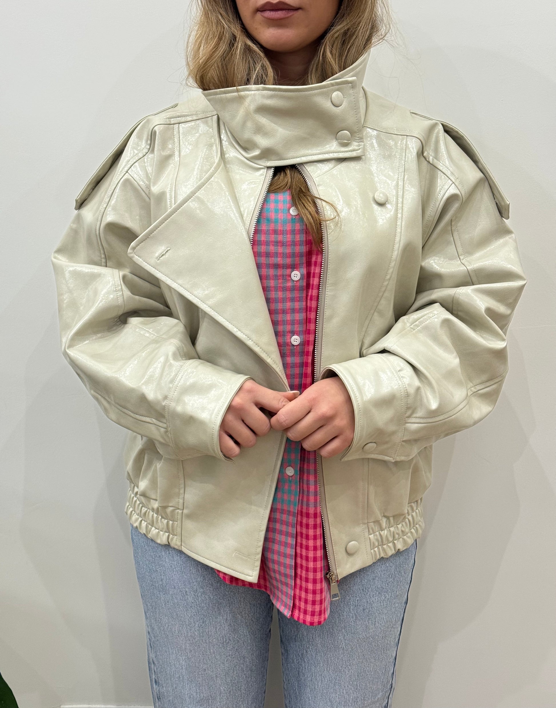 Chiodo in ecopelle in vernice. Chiusura con zip e bottoni, si può portare a collo alto.