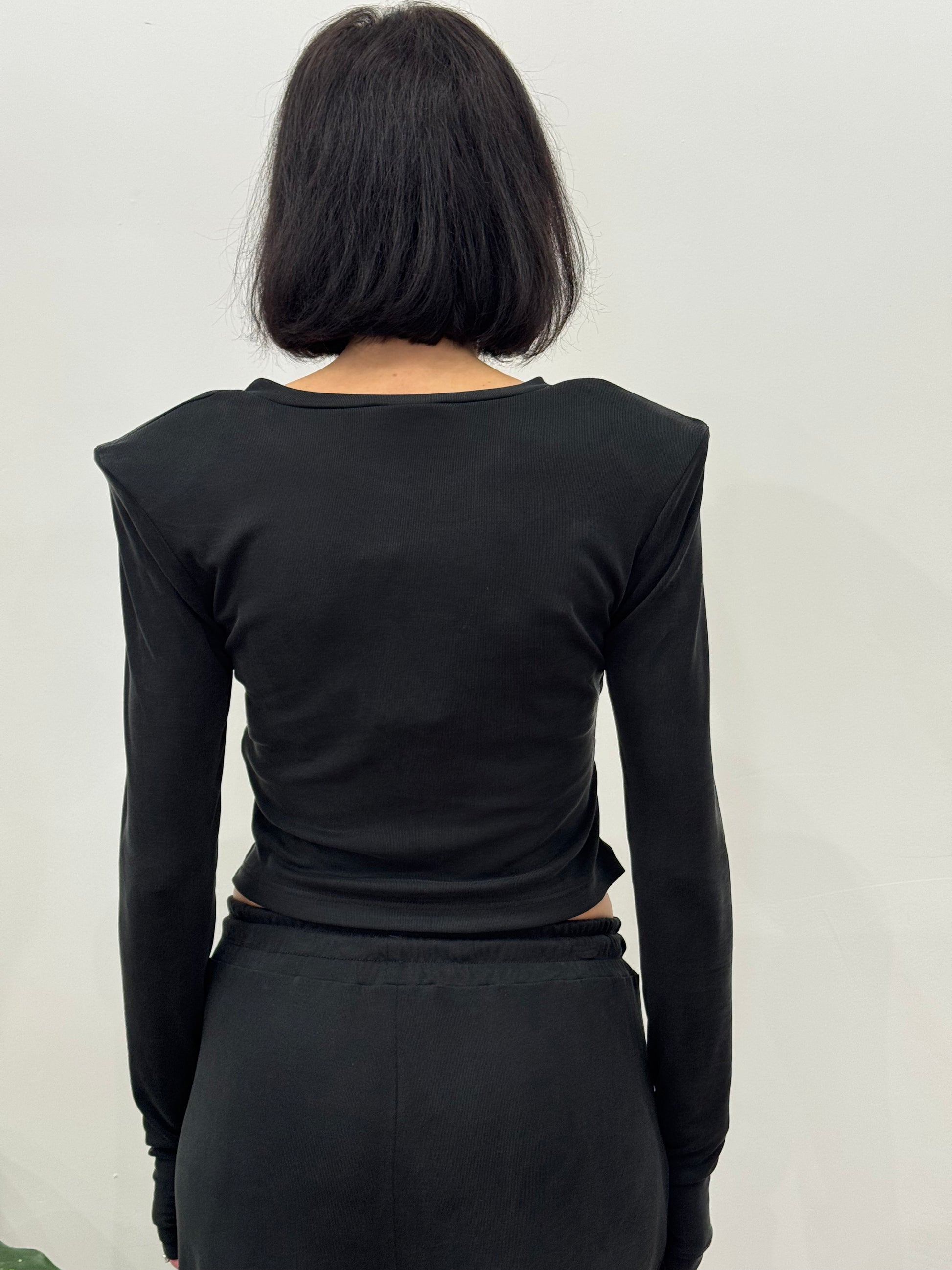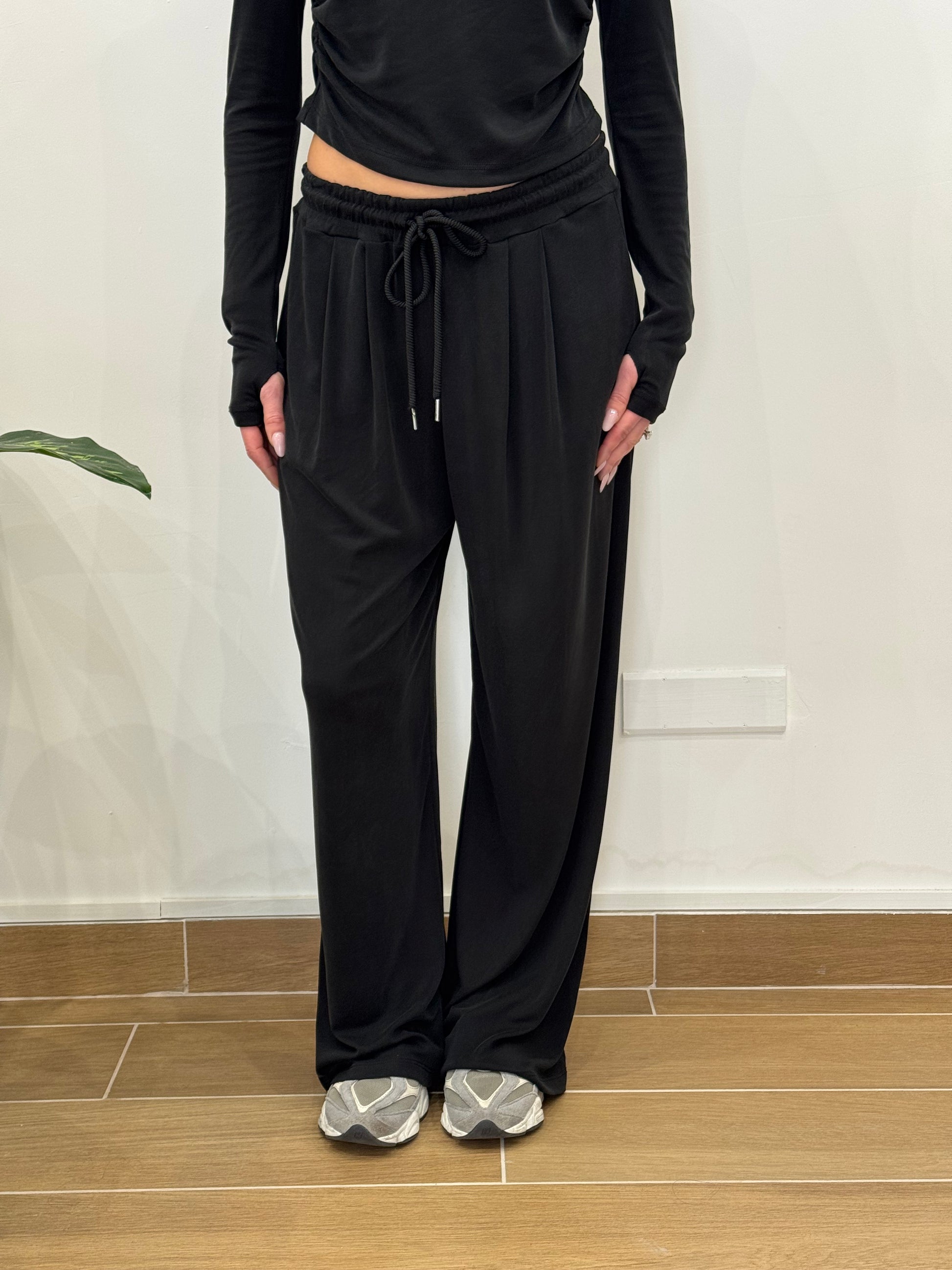 Coordinato due pezzi: maglietta a girocollo con spalline imbottite e manica a guanto, pantalone con elastico in vita, morbido e largo. Tessuto in viscosa ed elasticizzato.