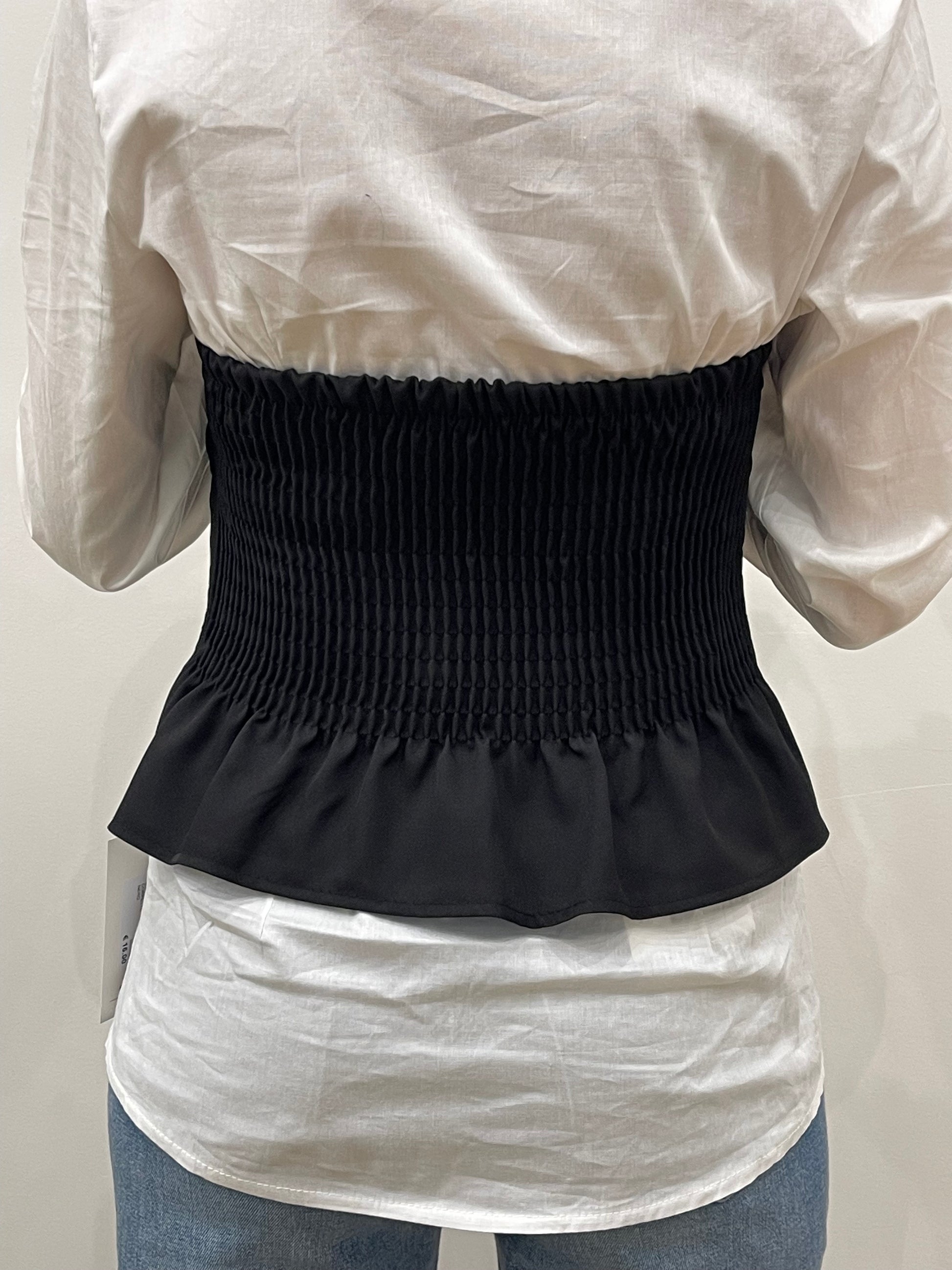 Corpetto con bottoni sul davanti e arricciatura sul retro. Porta la coppa all'interno. Elasticizzato.