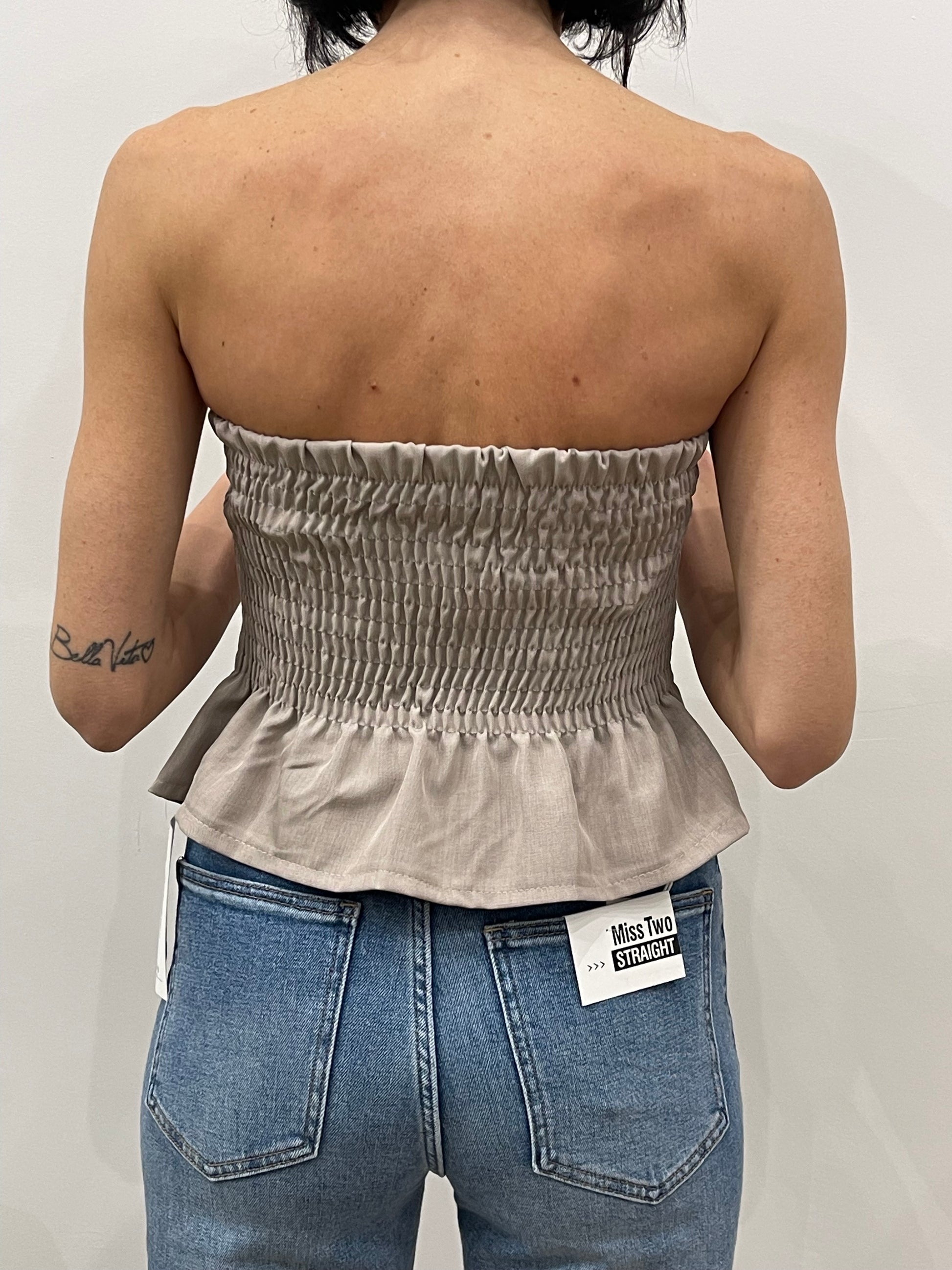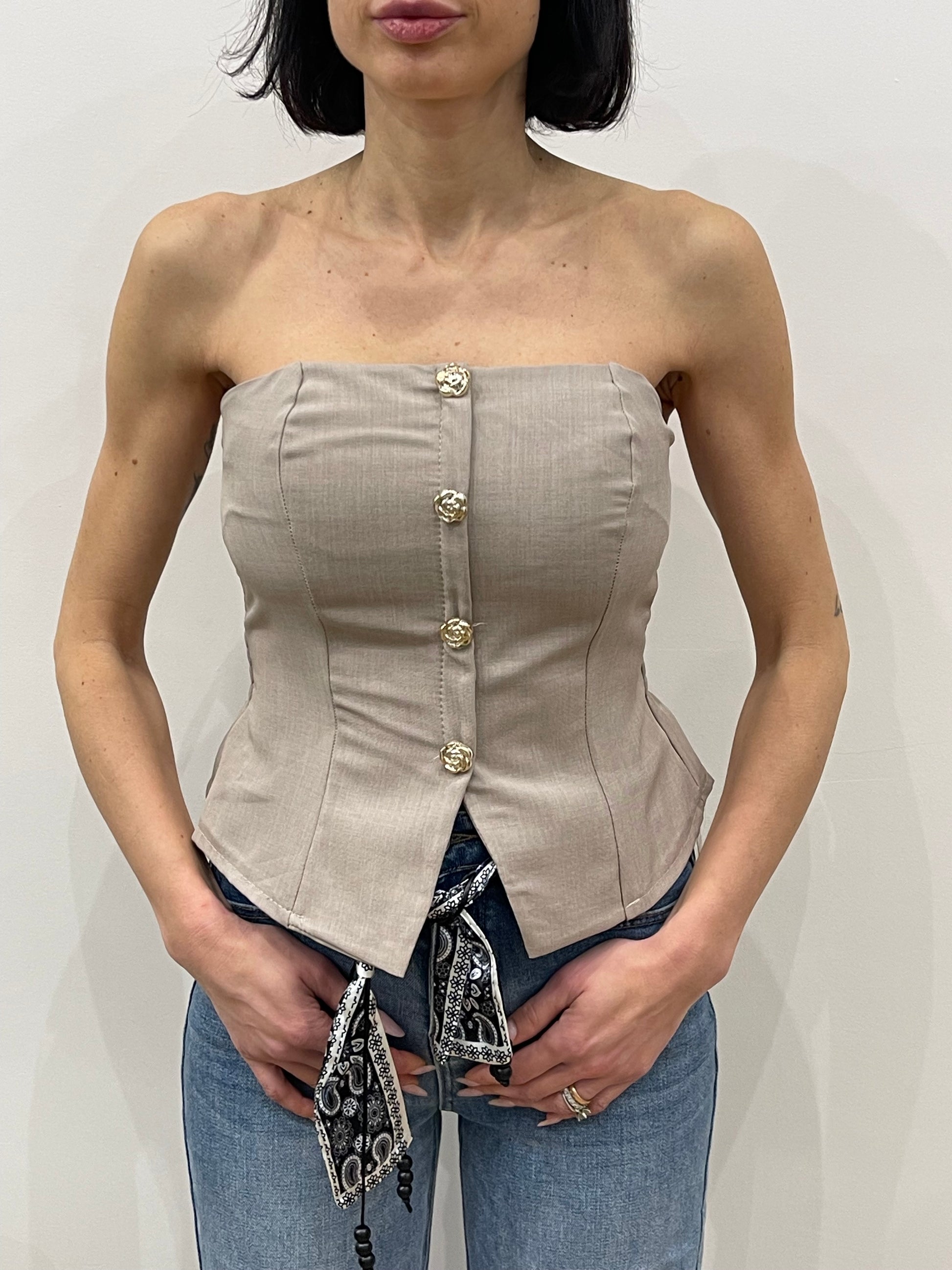 Corpetto con bottoni sul davanti e arricciatura sul retro. Porta la coppa all'interno. Elasticizzato.