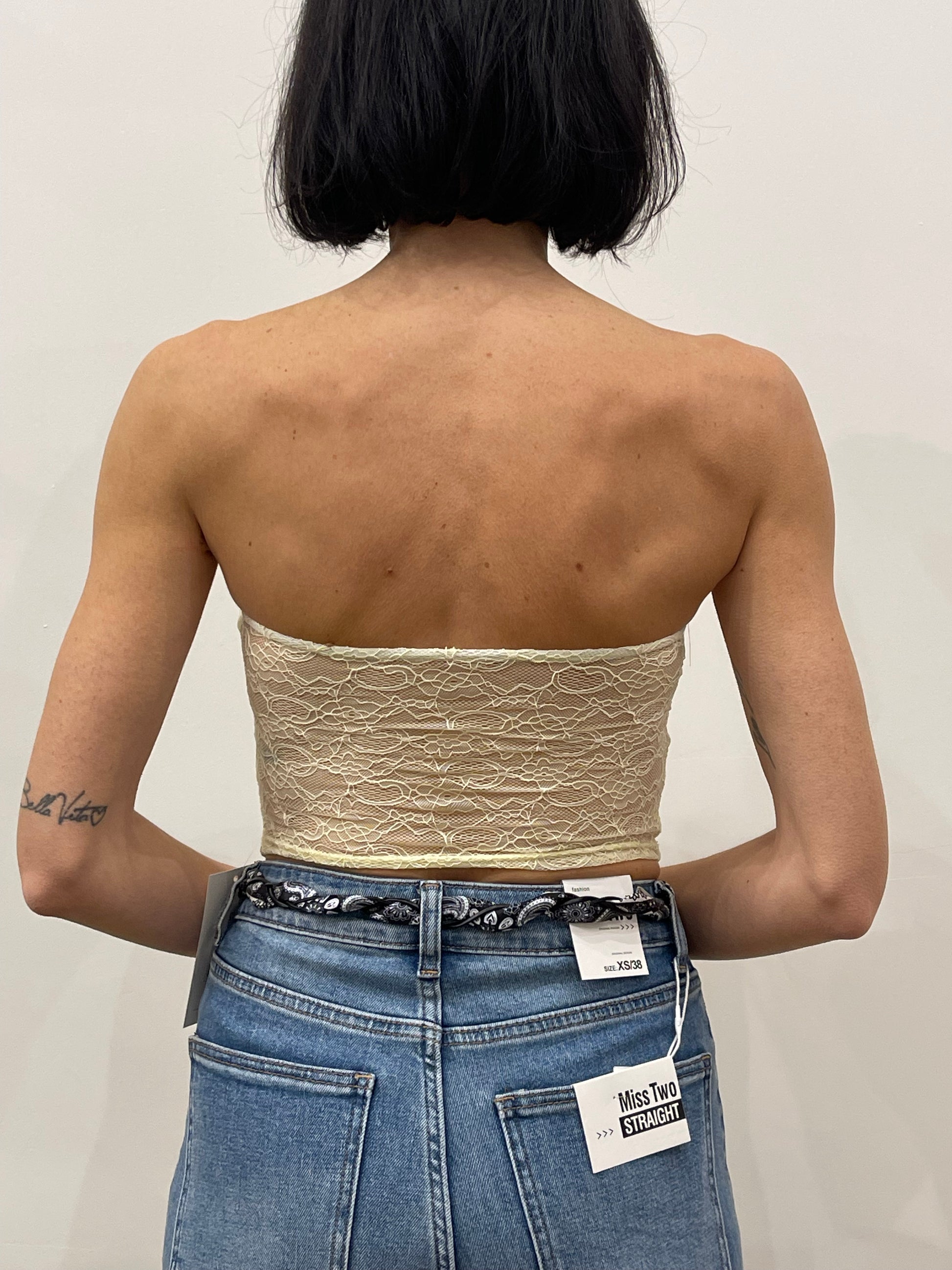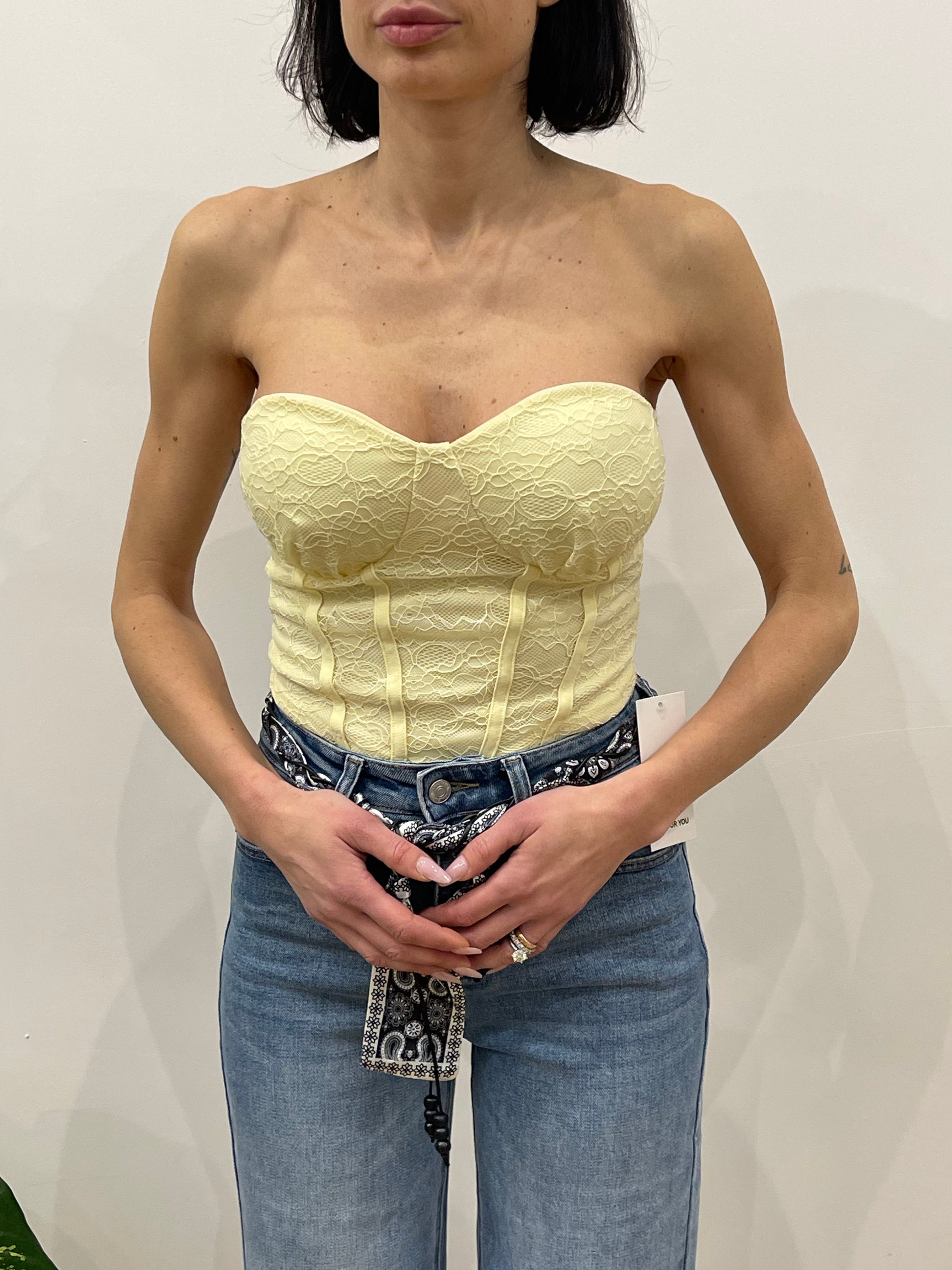 Corpetto in pizzo, elasticizzato. Porta le coppe preformate.