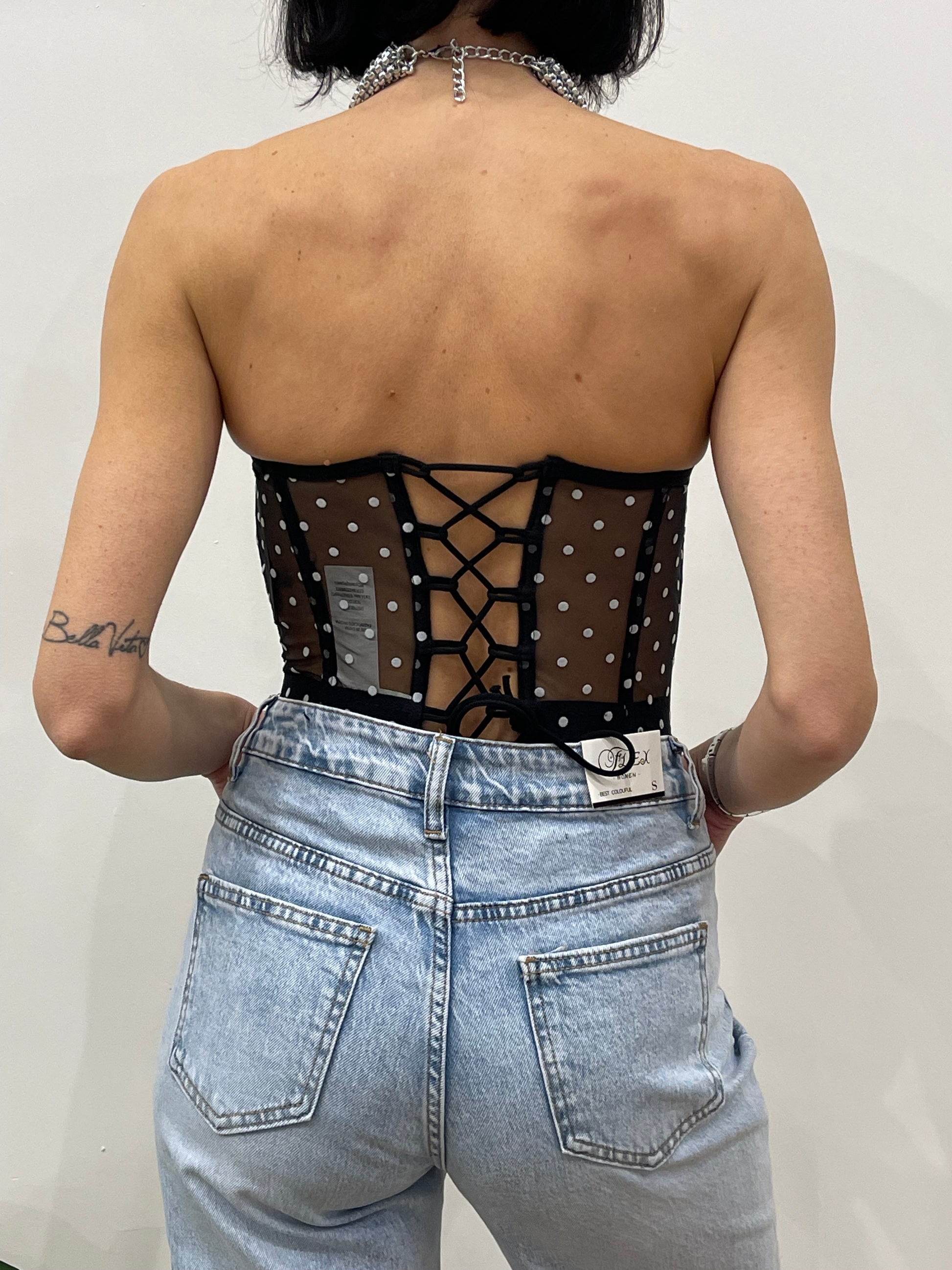 Corpetto a pois con stecche sul davanti e lacci sulla parte retro.