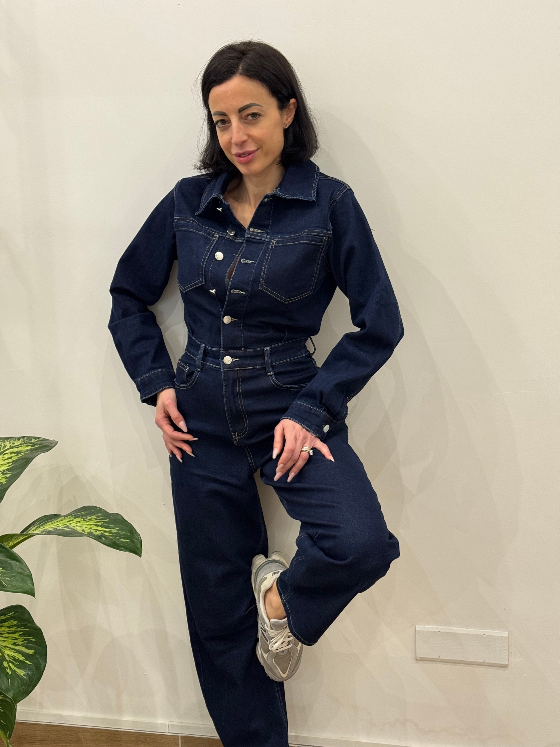 Jumpsuite dal tessuto elasticizzato. Chiusura con bottoni in argento, dettaglio del pantalone modello baloon.