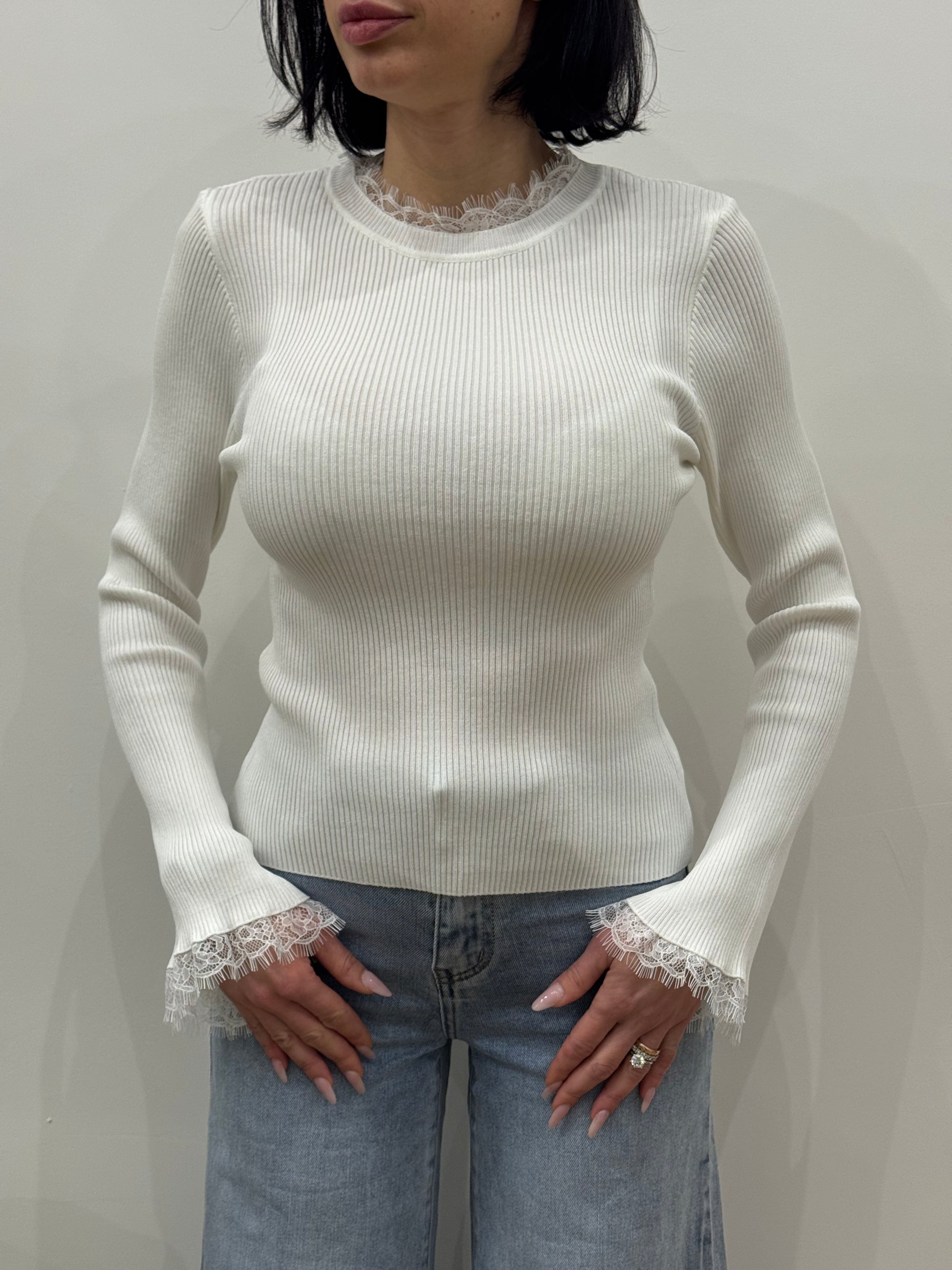 Maglietta in filo a costine con dettaglio sulla manica e sul girocollo del pizzo.