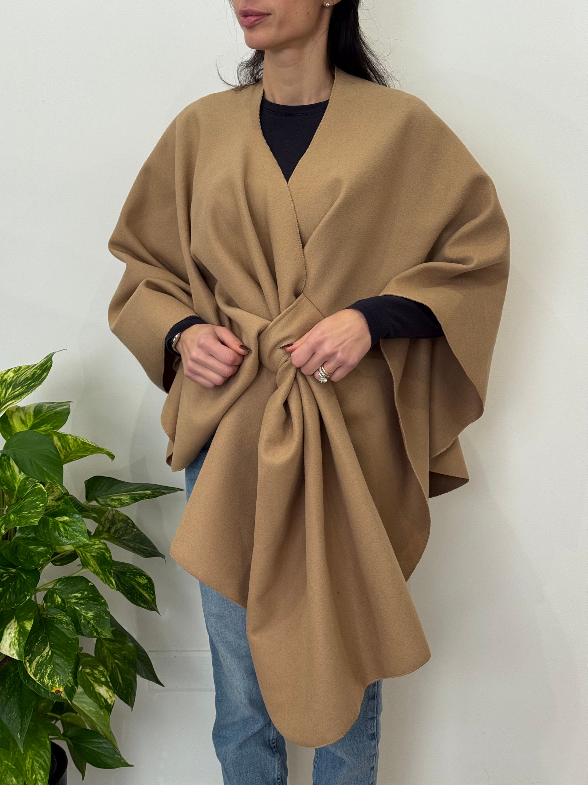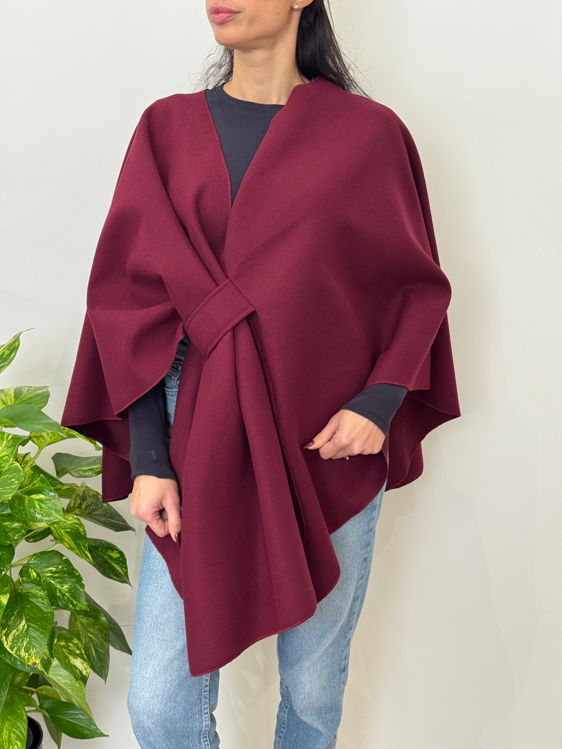 Mantella in caldo tessuto. Chiusura con il passante sul davanti.