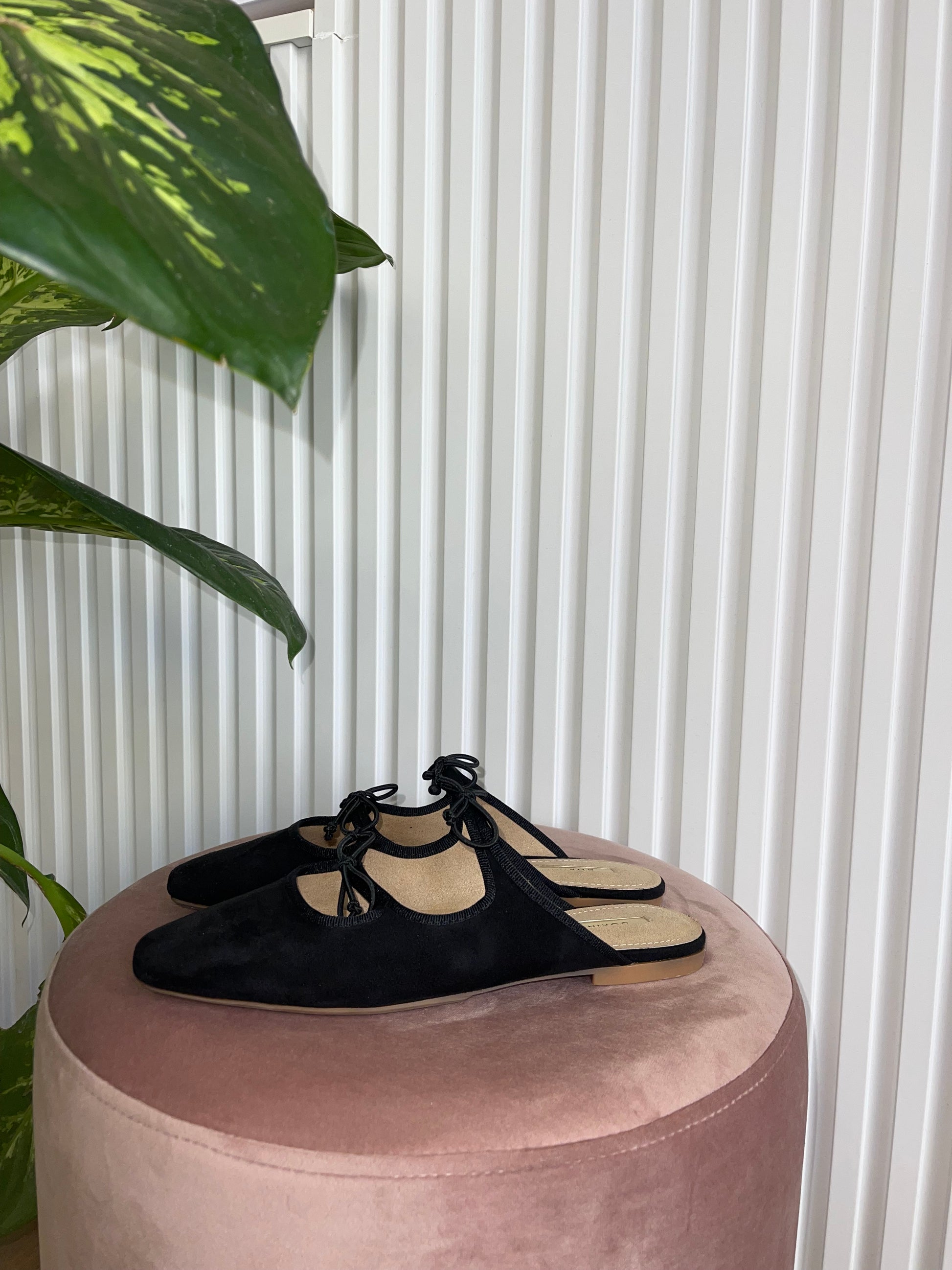 Sabot in suede, con fiocchetti.