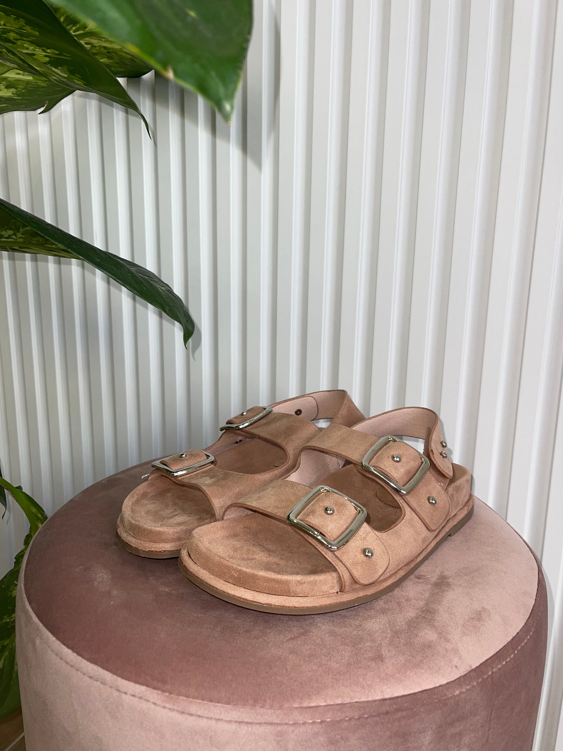 Sandalo in suede con doppia fascia regolabile e maxi fibbie.